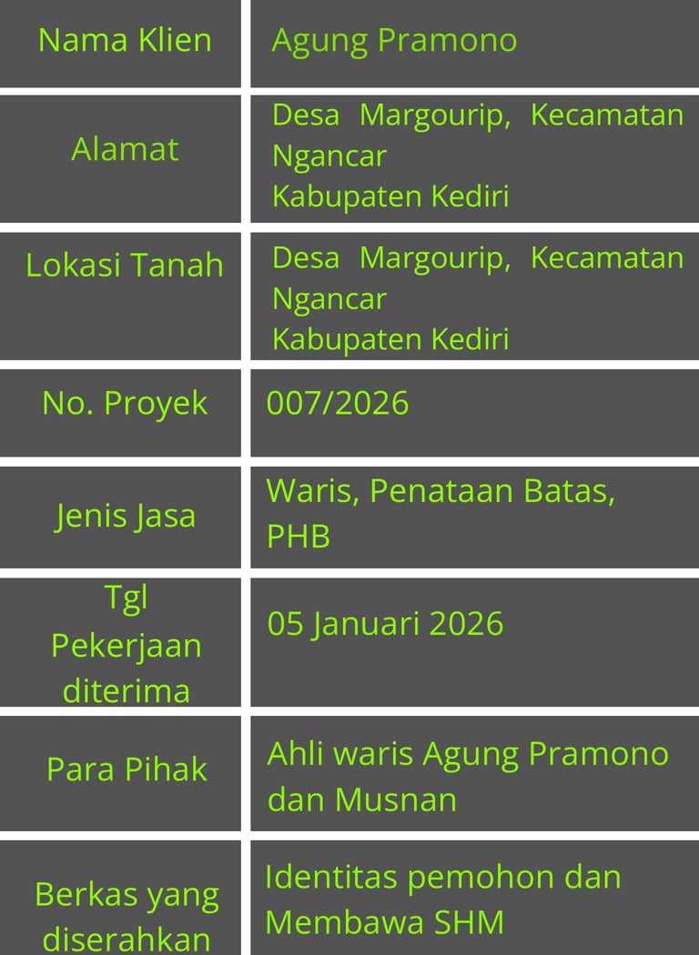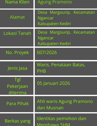 Tanggal 05 Januari 2026: Pemohon melimpahkan berkas identitas, SHM serta melengkapi persyaratan seperti Akta kematian orang tua ke kantor Bumi Pertiwi di terima oleh