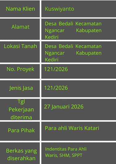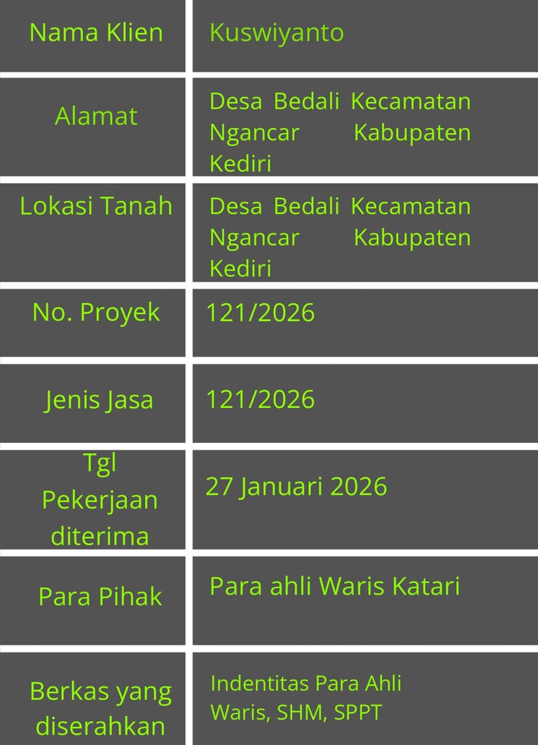 Tanggal 27 Januari 2026: Pemohon datang ke kantor Bumi Pertiwi dengan membawa identitas waris dari Katari setelah itu konsultasi, Setelah itu berkas di proses.